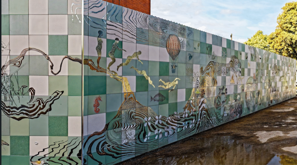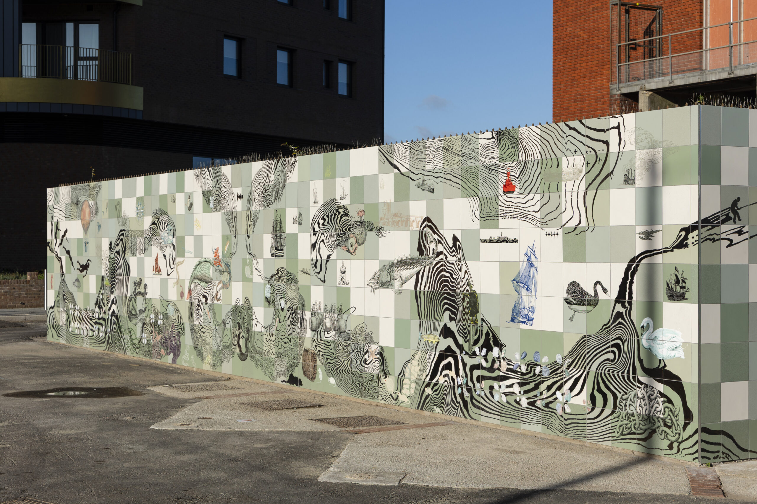 Together, the artists have collaborated to create a large ceramic tiled mural that wraps around the building illustrating the multi-layered history of water and the importance it plays in people’s lives, specifically in Chatham and Medway.