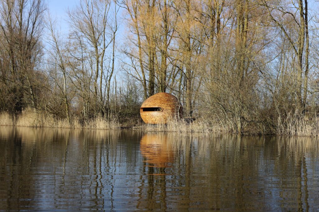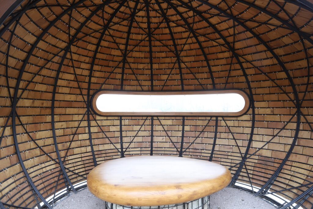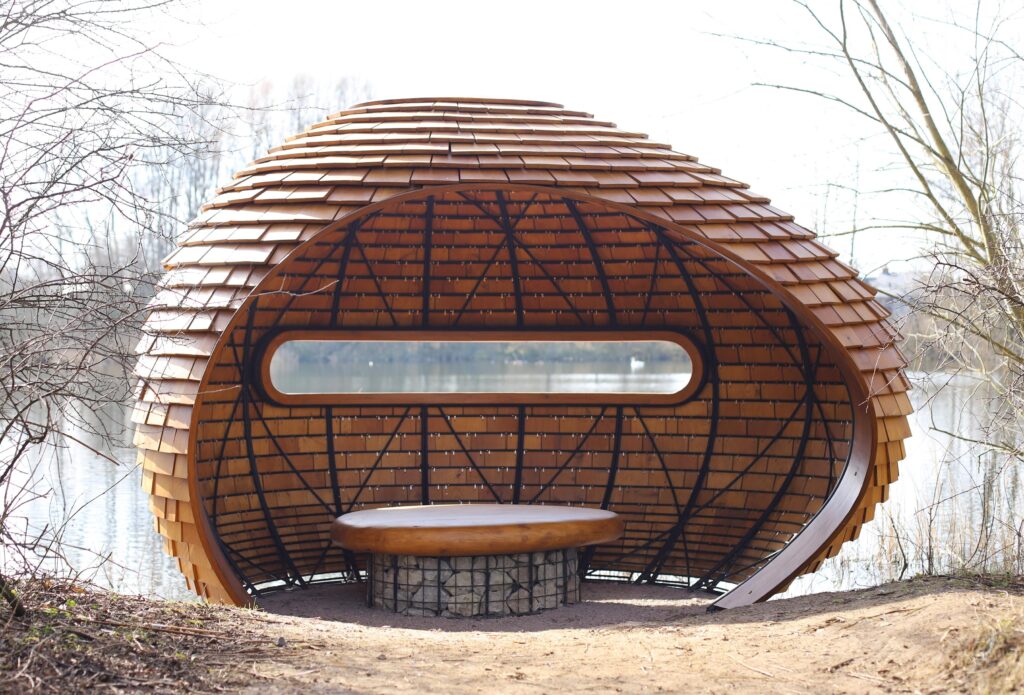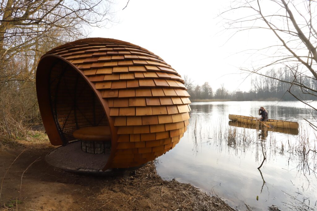 Artist and sculptor, Tim Norris has created a multi-functional artwork which serves as a beautiful bird hide, as well as a sculptural landmark designed for observation, contemplation, and engagement with the natural environment